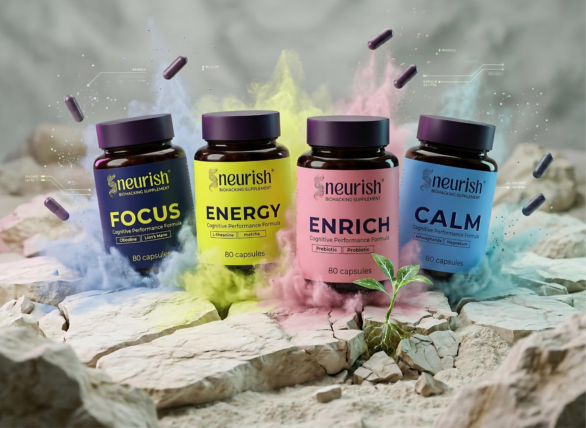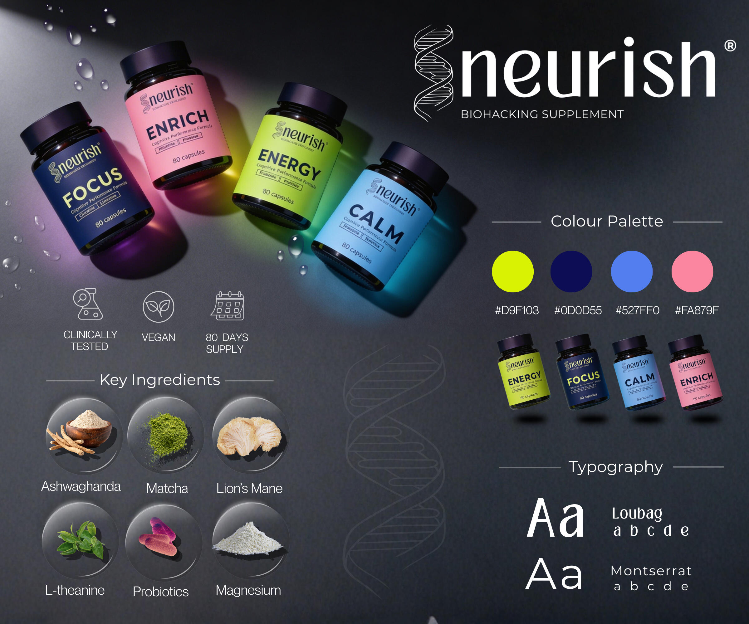 Neurish is a conceptual supplement brand designed around the idea of modern biohacking — supporting focus, energy, and mental clarity through science-driven ingredients.
